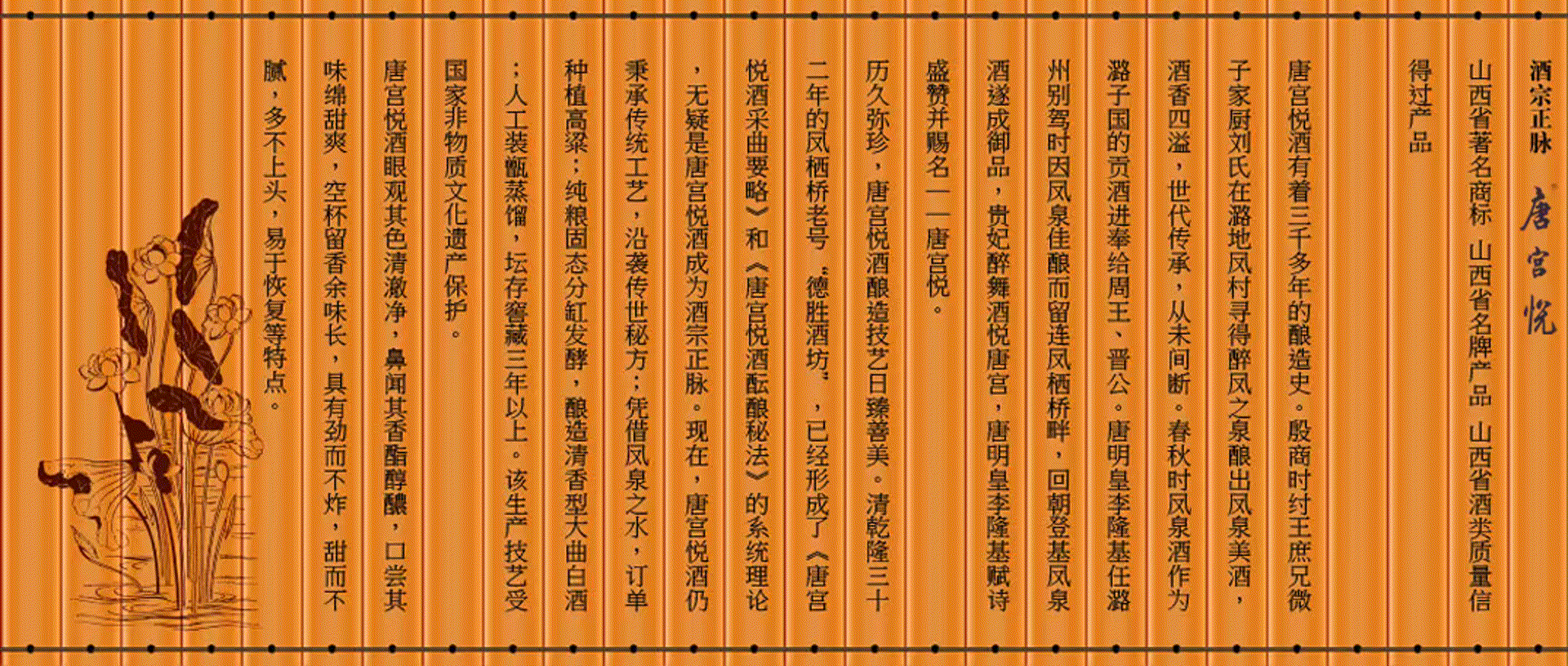 鳳棲橋釀業有限公司歷史悠久。從殷商微子家廚劉氏尋鳳泉釀酒至今,已有三千多年釀造史。劉氏后裔代傳代善, 才有唐明皇李隆基賜名“唐宮悅”,到清乾隆三十二年的鳳棲橋老號“德勝酒坊”已形成了《唐宮悅酒采曲要略》和《唐宮悅酒醞釀秘法》的系統理論的系統理論,直至建國初期的一九五二年才被當時的潞城邊區酒坊所接管,一九七四年改邊區酒坊成立國營潞城縣酒廠,二00六年改制為現公司公司地處晉冀豫三省通衢素有“商賈云集旱馬頭”美譽的微子古鎮……【詳細